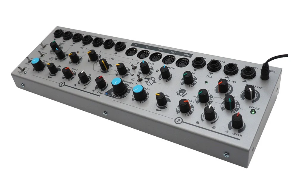 These days, the market is overwhelmed with DSP gear. Secondhand analog stuff is hard to find and even harder to maintain. Sherman offers you the Filterbank, which is basically a small modular synth that includes two multimode filters with an external audio input instead of oscillators. The box is equipped with 23 rotating knobs, a rotary and 6 toggle switches, 7 indicators, and 11 jack connections plus 5 MIDI sockets. No analog machine on the market contains so many features in just one handy box!