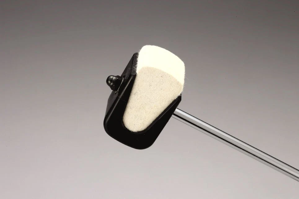 The hole in the beater hub is tear drop shaped so it securely holds the beater shaft and keeps the new two-sided beater from spinning. The new beater is felt on one side, and hard plastic on the other.